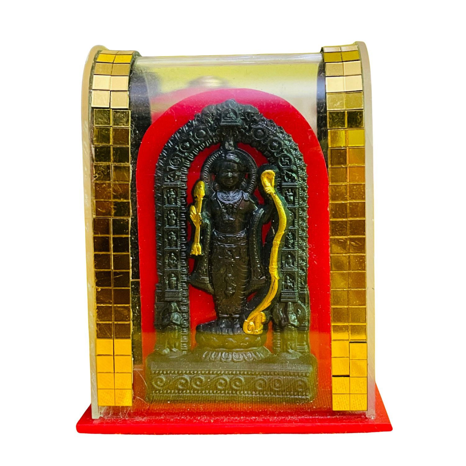 A compact and elegant Ram idol enclosed in a golden temple-style display box. Perfect for protecting the idol from dust while enhancing aesthetics. Suitable for car dashboards, study tables, pooja rooms, and gifting.