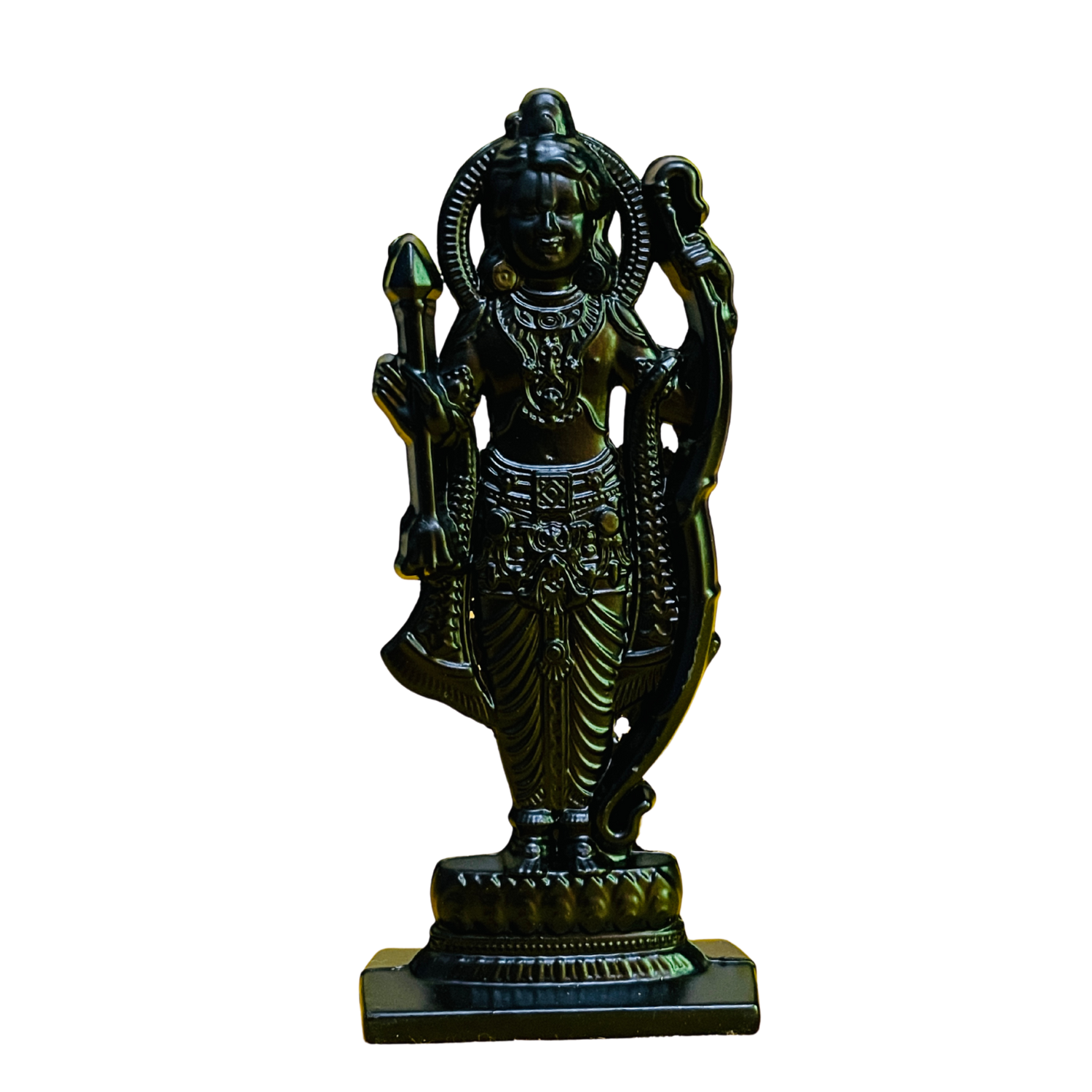 Bring divine blessings home with this elegant black finish standing Lord Ram idol. Featuring a bow and arrow design with intricate detailing, this statue is ideal for pooja rooms, showcases, and devotional gifting.